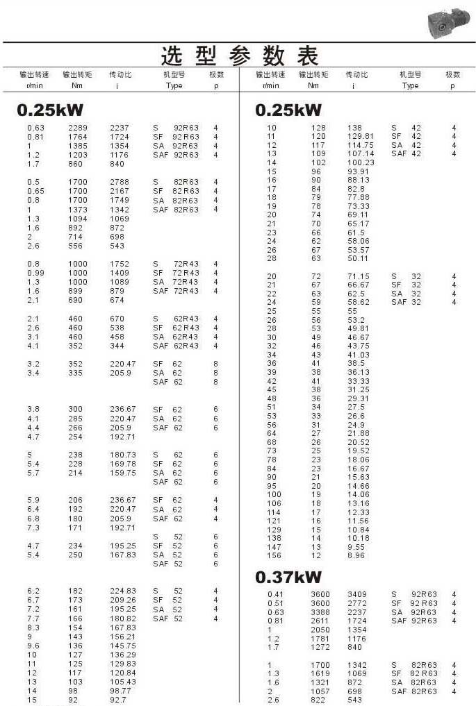 選型參數表0.25kW和0.37kW